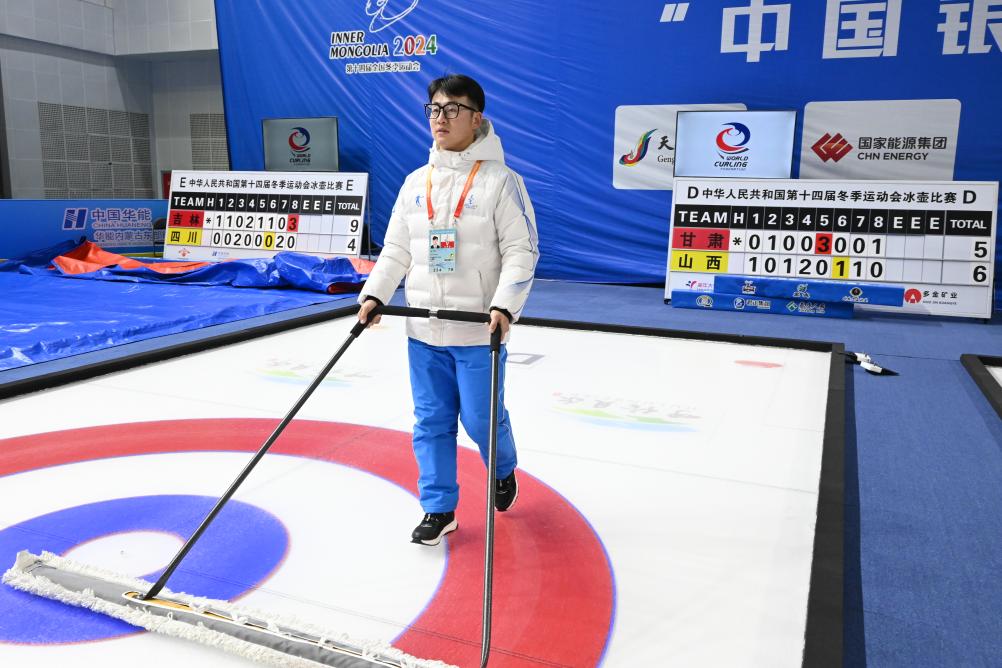 擦拭着冰壶赛道