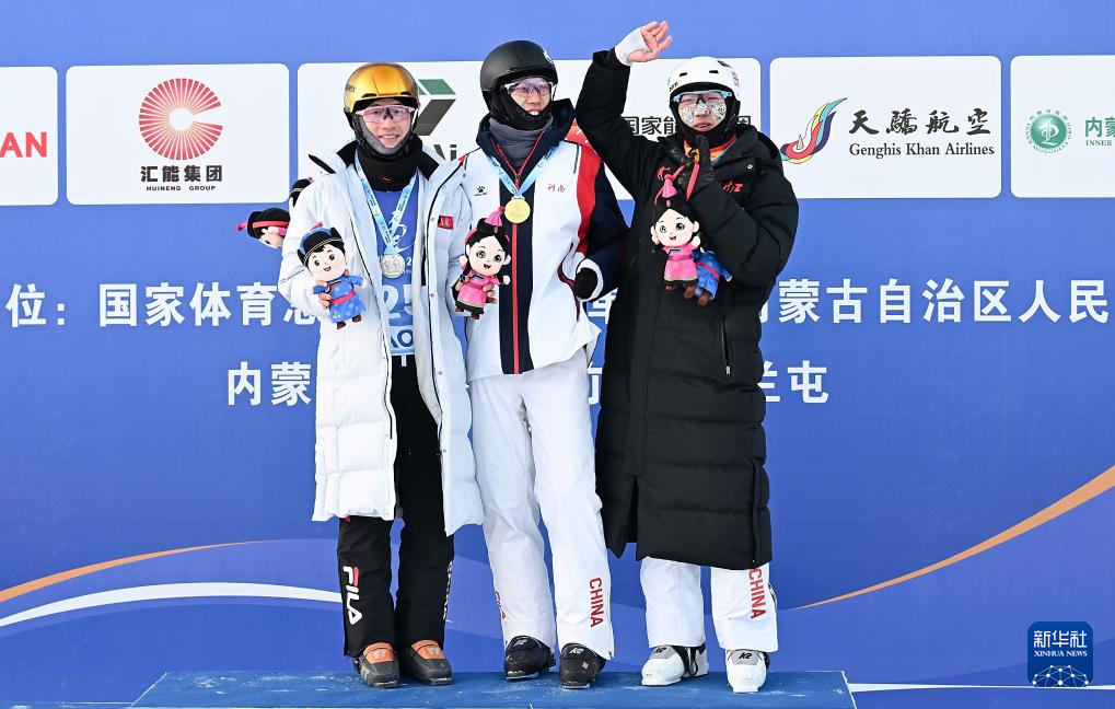 2月21日,冠军河南队选手陈硕(中)、亚军吉林队选手李天马(左)和季军黑龙江队选手方坤在自由式滑雪公开组男子空中技巧颁奖仪式上。新华社记者 杨冠宇 摄