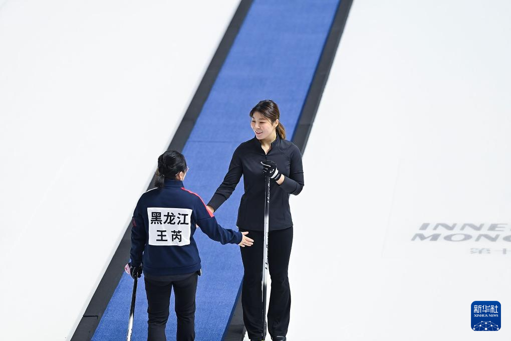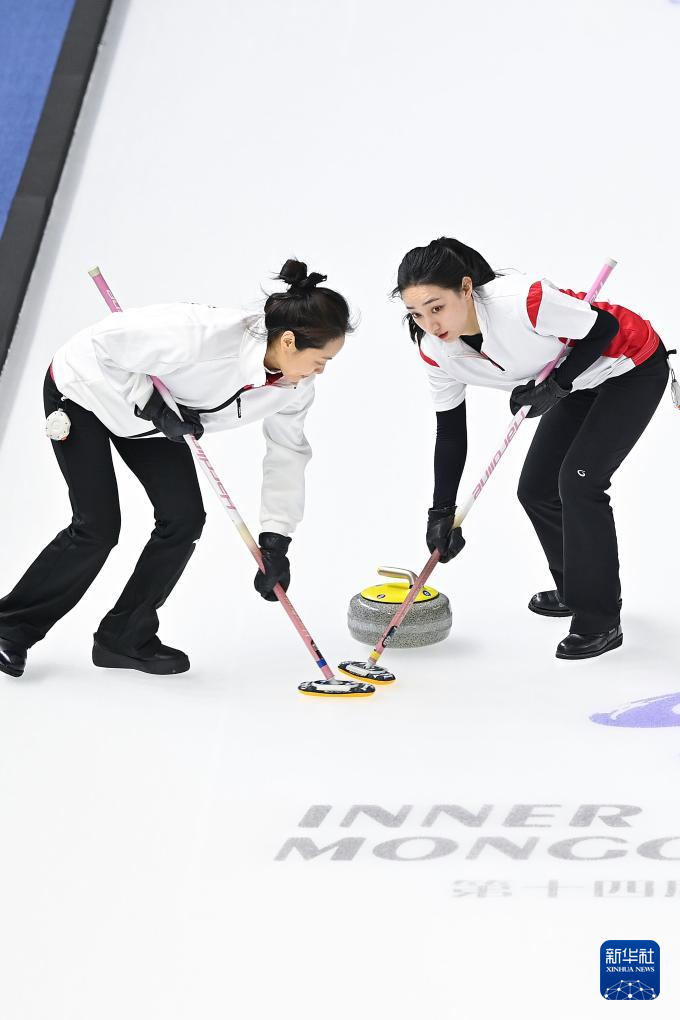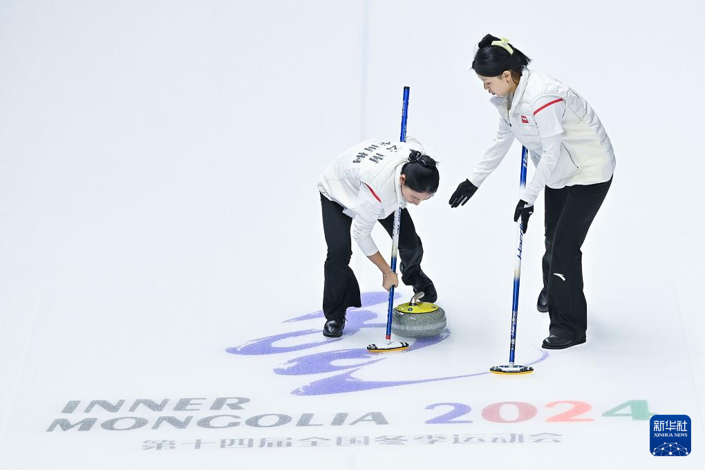 当日,第十四届全国冬季运动会冰壶项目公开组女子循环赛第三轮比赛在呼伦贝尔市内蒙古冰上运动训练中心举行。
