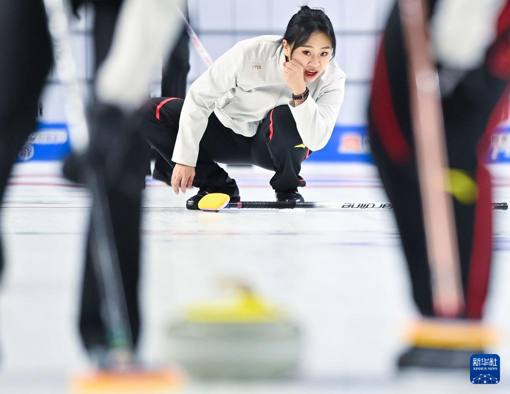 2月22日,山西队选手于晓涵(中)在比赛中。最终,山西队12比4战胜甘肃队。新华社记者 杨晨光 摄