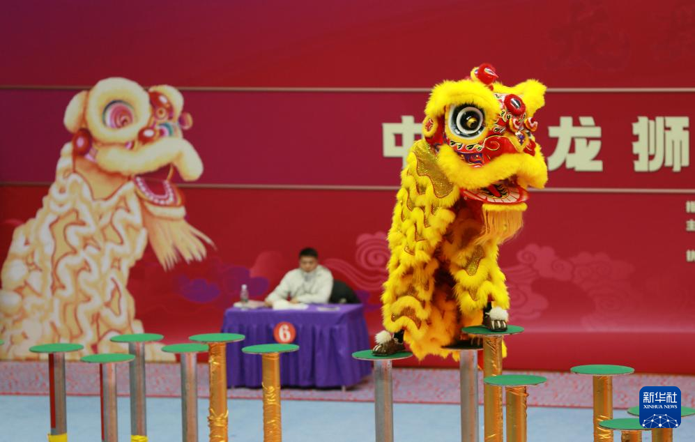 2月22日,广东东莞长安镇龙狮运动协会代表队在南狮比赛中。新华社发(任飞摄)