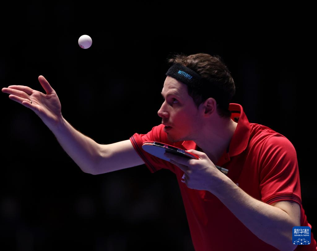 2月23日,丹麦队选手约纳坦·格罗特在第四盘比赛中发球。最终,他1比3不敌韩国队选手林仲勋。新华社记者 姚琪琳 摄