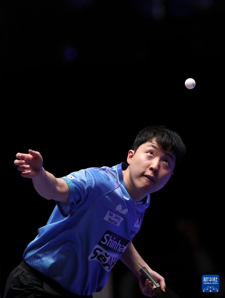 2月23日,韩国队选手林仲勋在第一盘比赛中发球。最终,他3比1战胜丹麦队选手安德斯·林德。新华社记者 姚琪琳 摄
