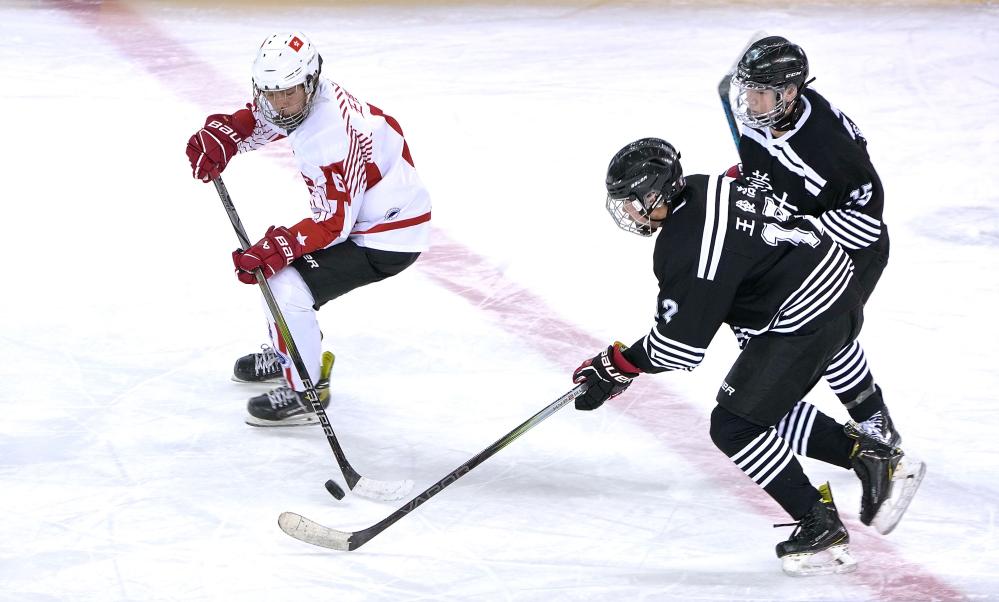 2月22日,内蒙古队球员王俊浩(中)与香港队球员王赞霖(左)在比赛中拼抢。新华社记者 李欣 摄
