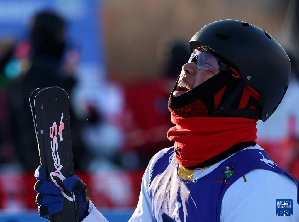 2月22日,河北队选手李心鹏在比赛中庆祝。最终,他获得冠军。新华社记者 王楷焱 摄
