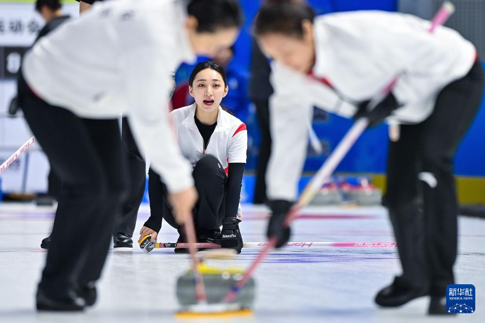 2月23日,四川队选手姜思淼(中)在比赛中指挥队友擦冰。最终,四川队5比4战胜云南队。新华社记者 杨晨光 摄