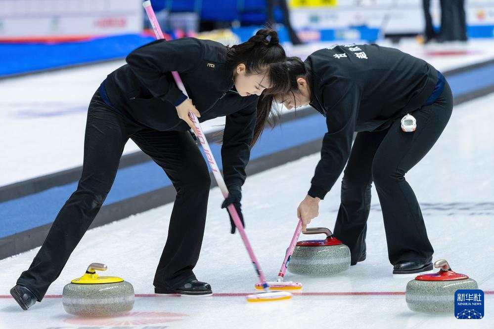 2月23日,甘肃队选手闫琴(左)、赵欣然在比赛中。最终,甘肃队6比9不敌天津队。新华社记者 陈欣波 摄