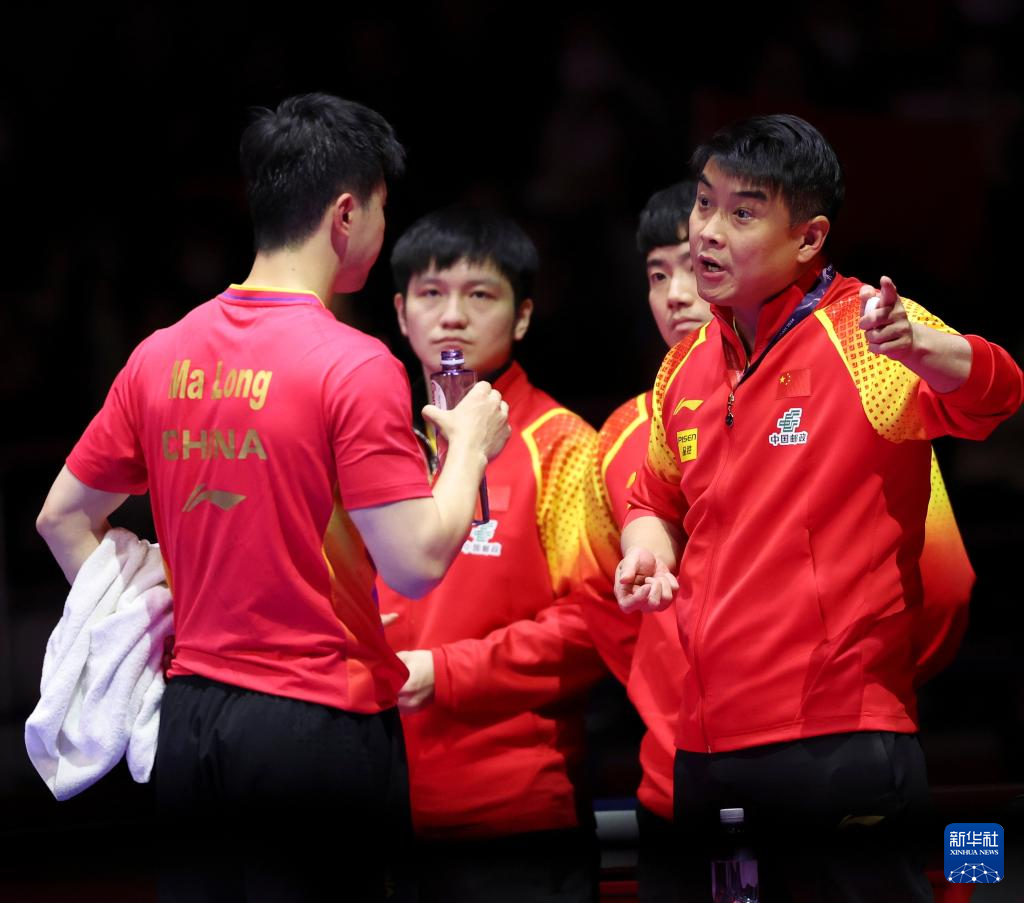2月22日,中国队选手马龙(左一)在第三盘比赛中接受教练王皓(右一)的指导。马龙3比1战胜日本队选手篠塚大登。新华社记者 姚琪琳 摄