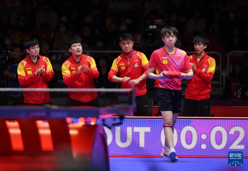 2月22日,中国队选手王楚钦(右二)在比赛暂停结束后走向球台。他在第二盘比赛中3比1战胜日本队选手张本智和。新华社记者 陶希夷 摄