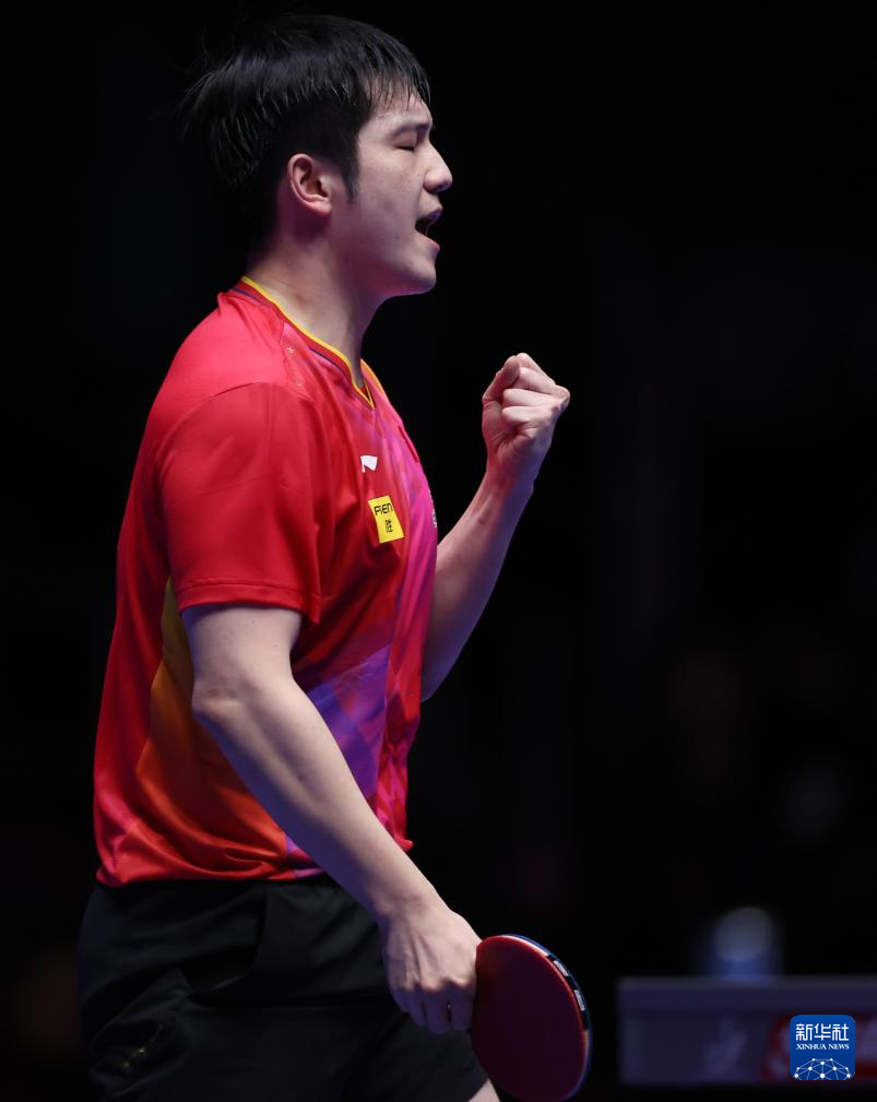 2月22日,中国队选手樊振东在第一盘比赛中庆祝得分。他3比1战胜日本队选手松岛辉空。新华社记者 姚琪琳 摄