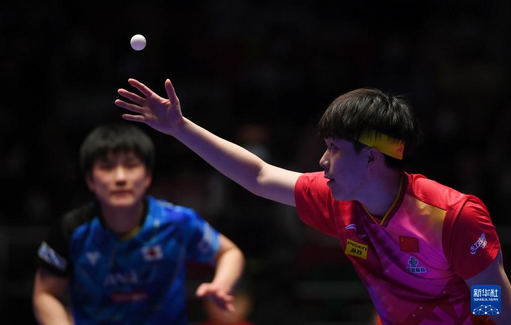 2月22日,中国队选手王楚钦(右)在第二盘比赛中发球。他3比1战胜日本队选手张本智和。新华社记者 陶希夷 摄