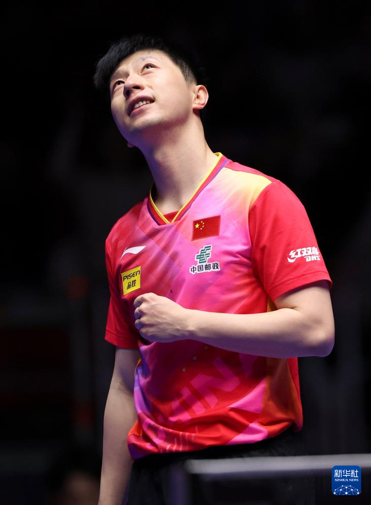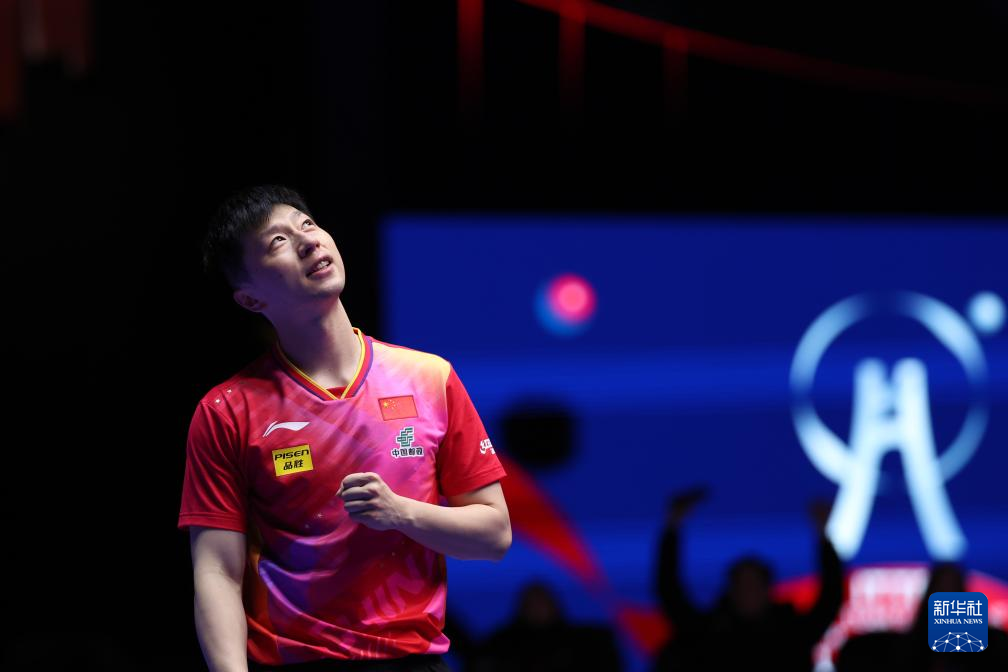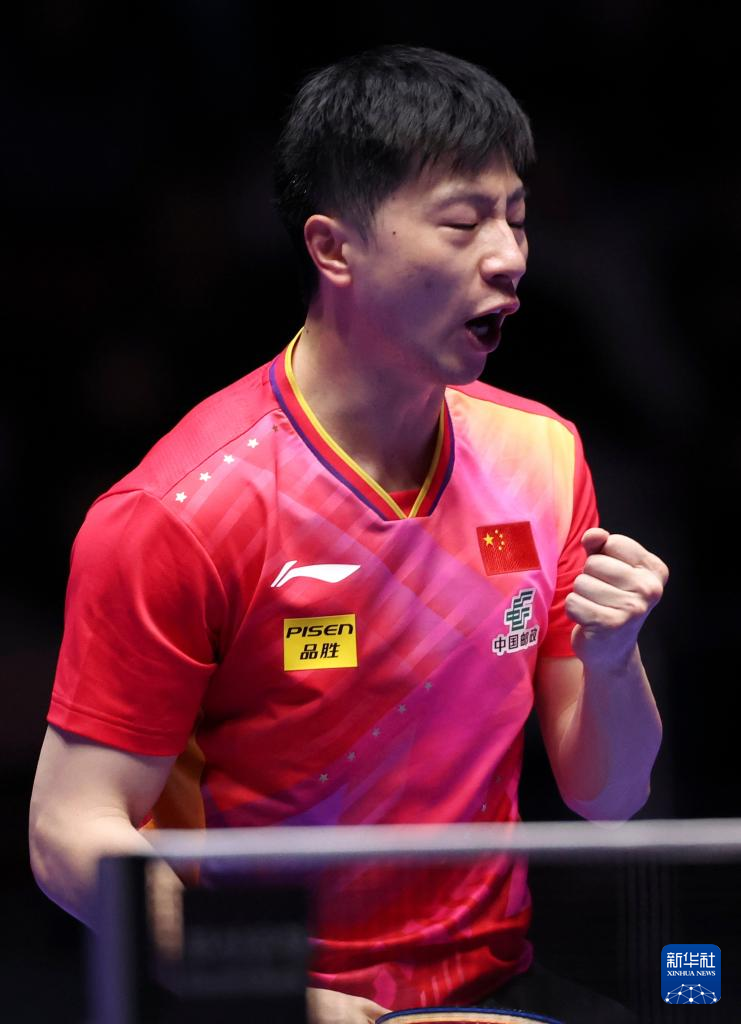 2月22日,中国队选手马龙庆祝比赛胜利。他在第三盘比赛中3比1战胜日本队选手篠塚大登。新华社记者 姚琪琳 摄