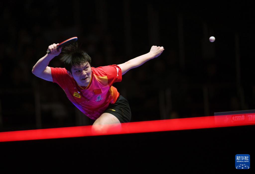 2月22日,中国队选手王楚钦在第二盘比赛中回球。他3比1战胜日本队选手张本智和。新华社记者 杨世尧 摄