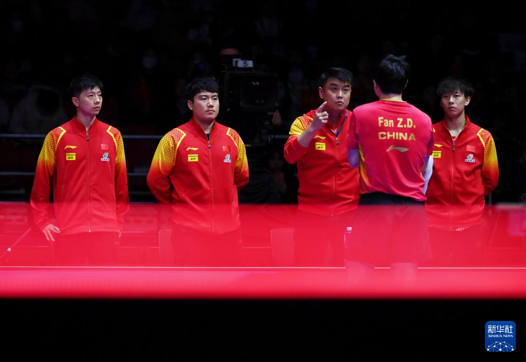 2月22日,中国队选手樊振东(右二)在第一盘比赛中接受教练王皓(右三)的指导。樊振东3比1战胜日本队选手松岛辉空。新华社记者 陶希夷 摄