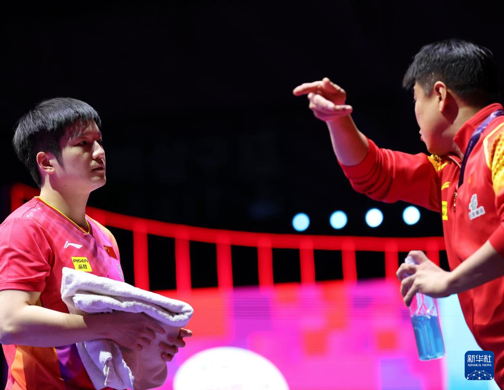 2月22日,中国队选手樊振东(左)在第一盘比赛中接受教练王皓的指导。樊振东3比1战胜日本队选手松岛辉空。新华社记者 姚琪琳 摄