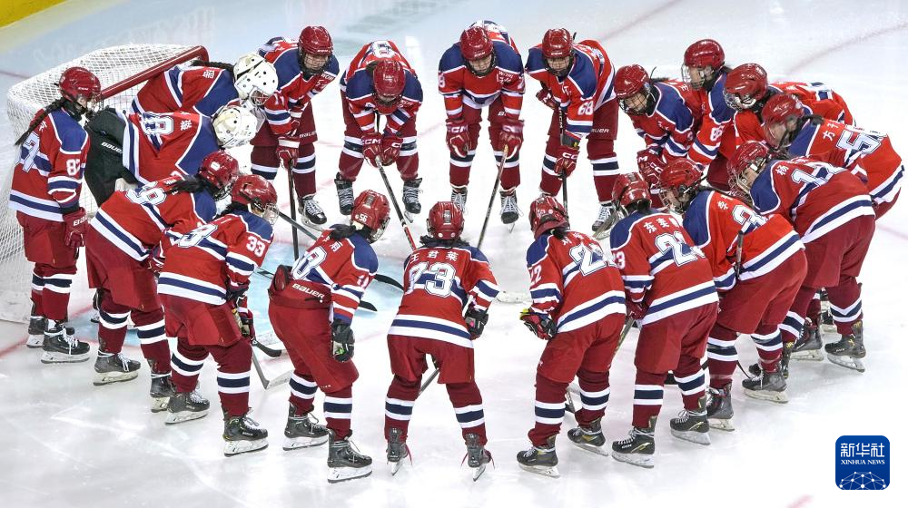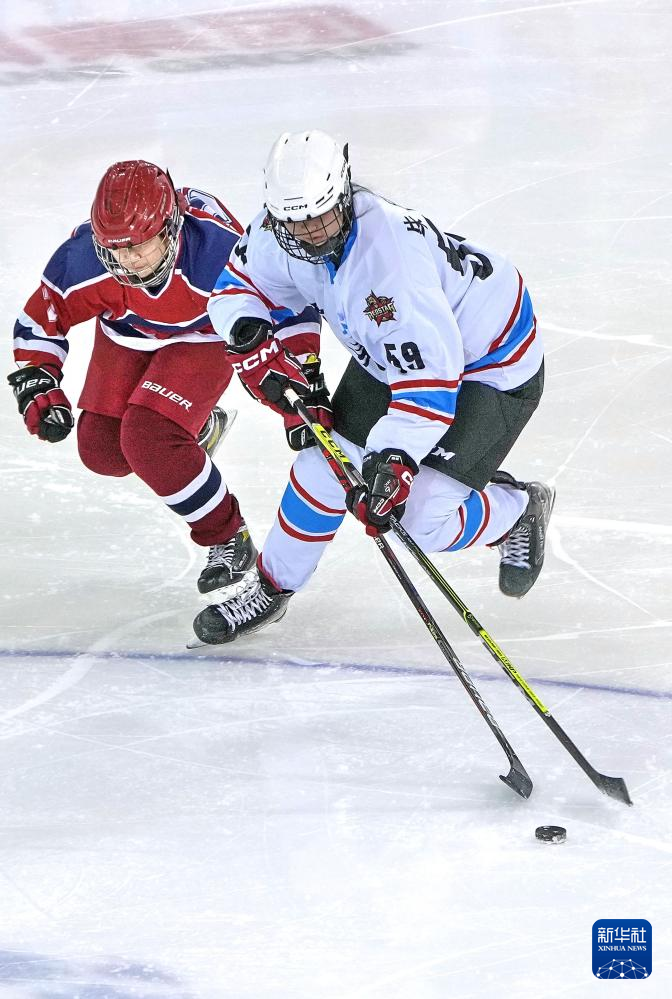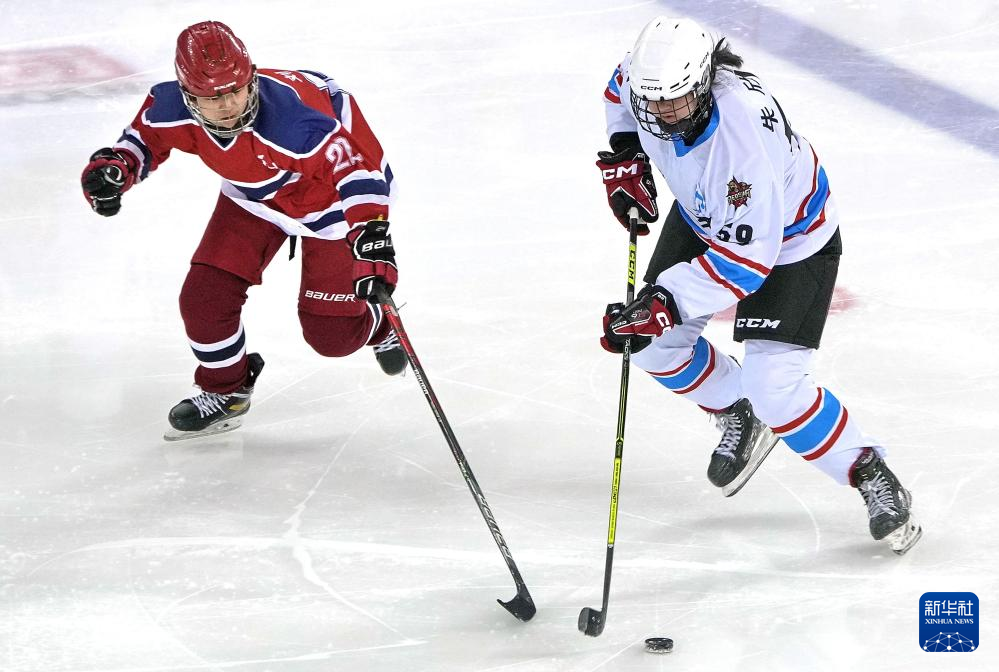 当日,在内蒙古冰上运动训练中心冰球馆举行的第十四届全国冬季运动会冰球项目女子青年组淘汰赛中,河北队4比3战胜广东队。
