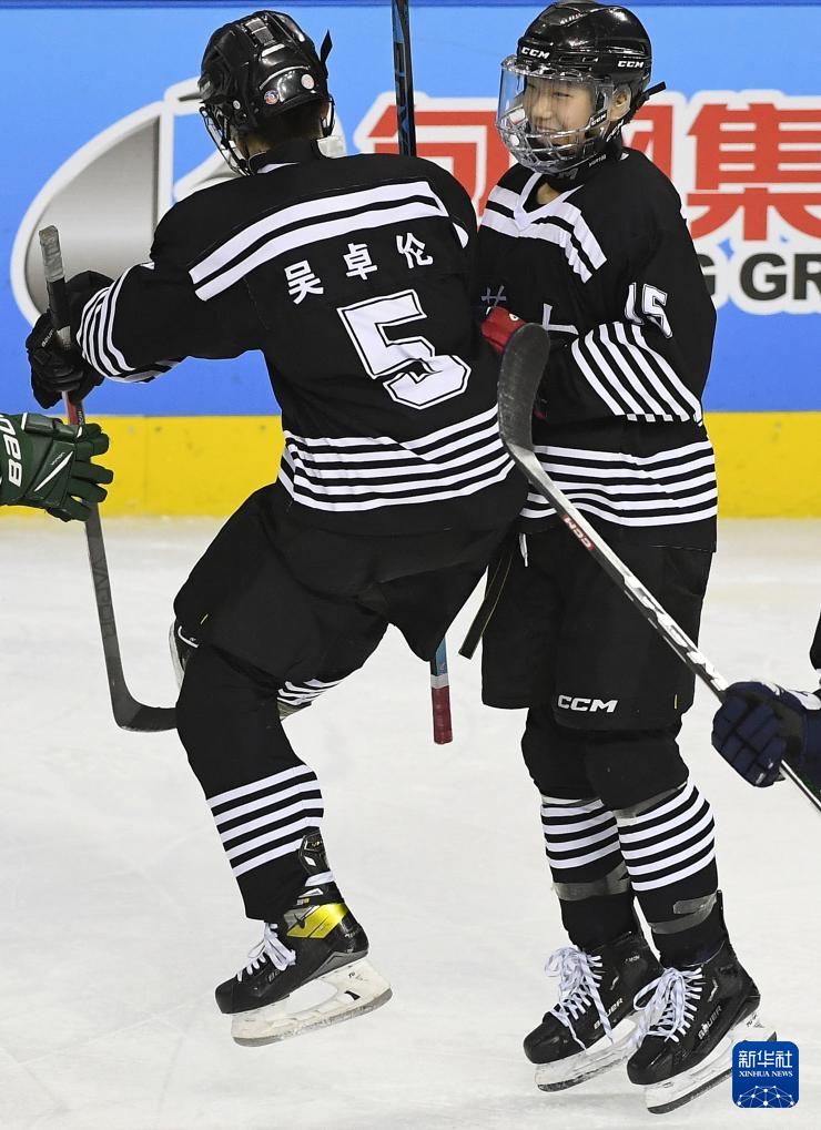 2月24日,内蒙古队球员蔺辰元(右)在比赛中与队友吴卓伦庆祝进球。新华社记者 邓华 摄