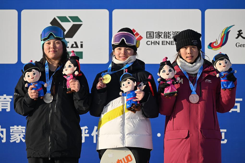 新华社呼伦贝尔2月23日电(记者谷训、卢星吉、刘博、梁婉珊)23日,第十四届全国冬季运动会单板滑雪公开组大跳台比赛在扎兰屯金龙山滑雪场进行。北京冬奥冠军苏翊鸣代表山西队强势夺金,广西小将甘佳佳夺得女子组金牌。