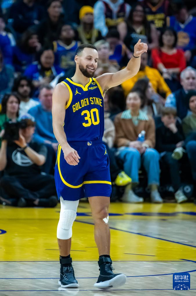2月23日,勇士队球员库里在比赛中庆祝。新华社发(董旭东摄)