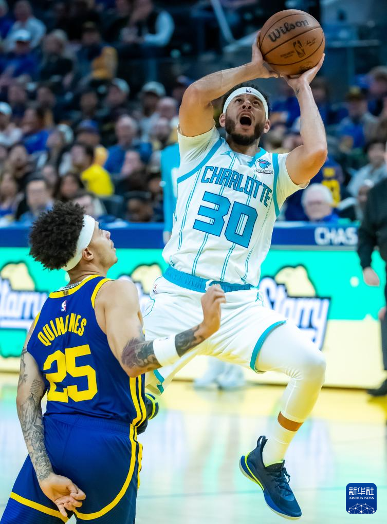 2月23日,黄蜂队球员塞斯·库里(右)在比赛中投篮。新华社发(董旭东摄)
