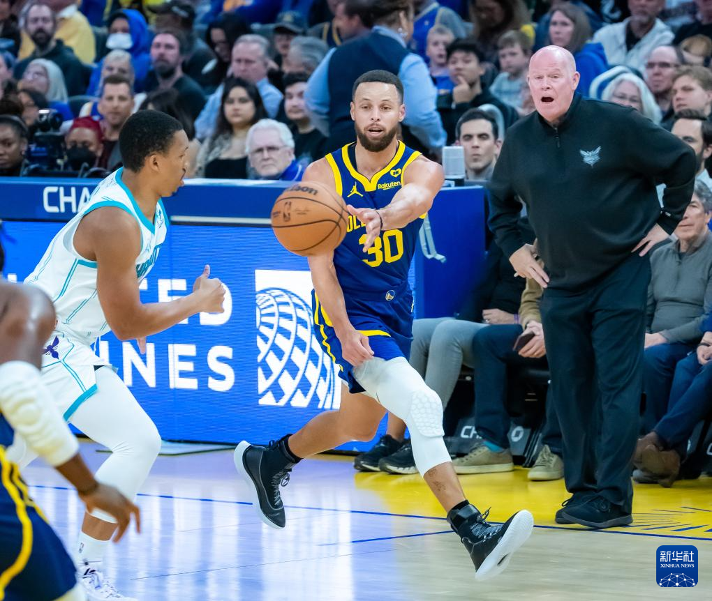 2月23日,勇士队球员斯蒂芬·库里(中)在比赛中传球。新华社发(董旭东摄)
