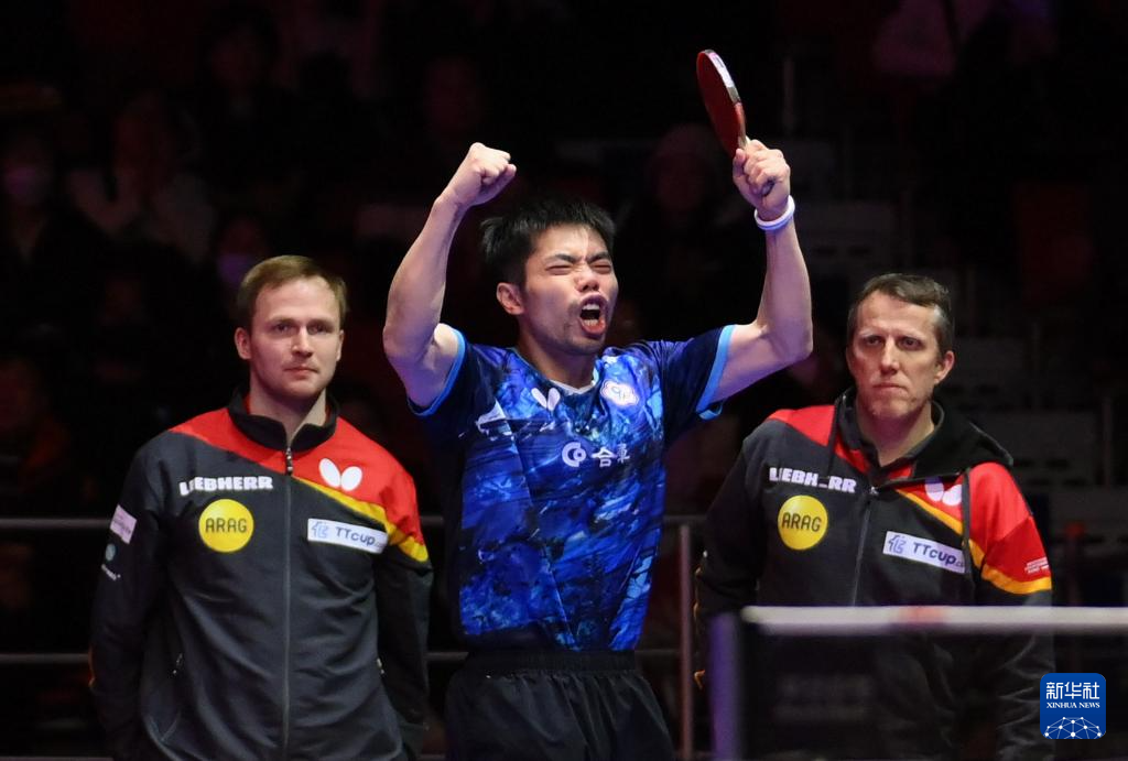 2月23日,中国台北队选手庄智渊(中)庆祝战胜对手。他3比2战胜德国队选手邱党。新华社记者 陶希夷 摄