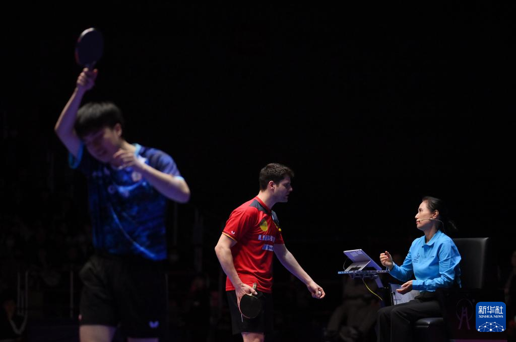 2月23日,德国队选手迪米特里·奥恰洛夫(中)对裁判判罚表示异议。他2比3不敌中国台北选手林昀儒。新华社记者 陶希夷 摄