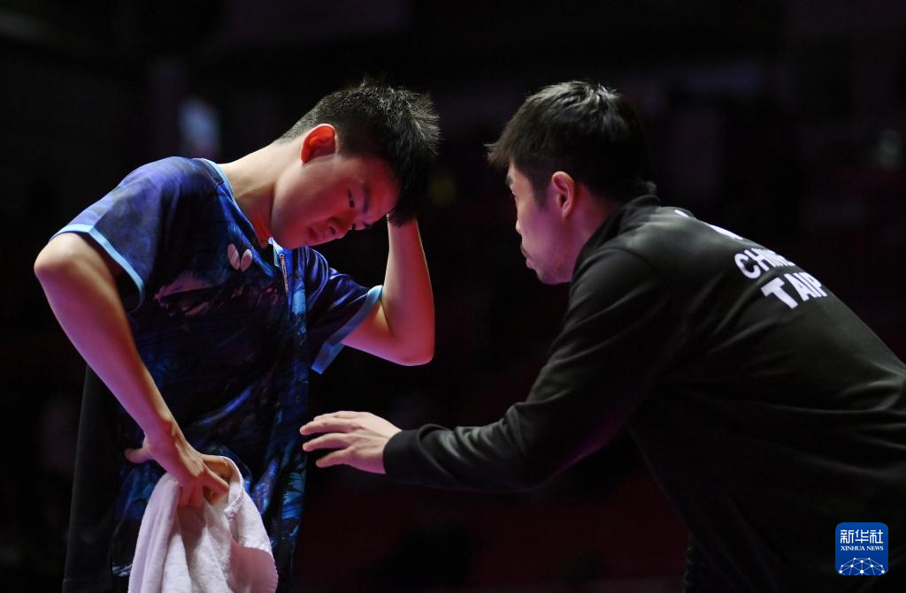 2月23日,中国台北队选手高承睿(左)在比赛间隙接受庄智渊指导。他3比1战胜德国队选手帕特里克·弗朗西斯卡。新华社记者 陶希夷 摄
