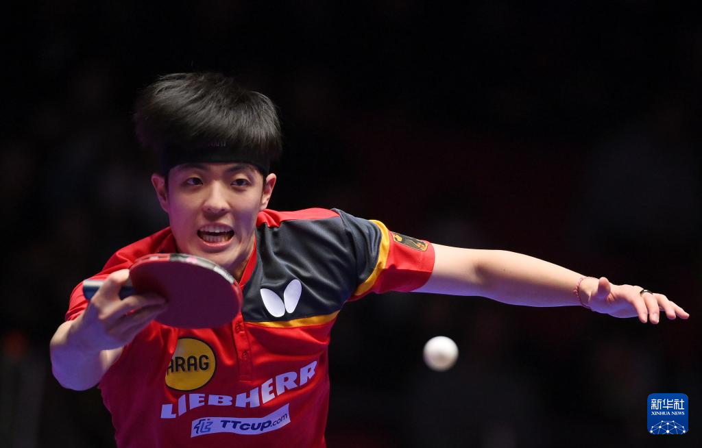 2月23日,德国队选手邱党在比赛中回球。他2比3不敌中国台北队选手庄智渊。新华社记者 陶希夷 摄