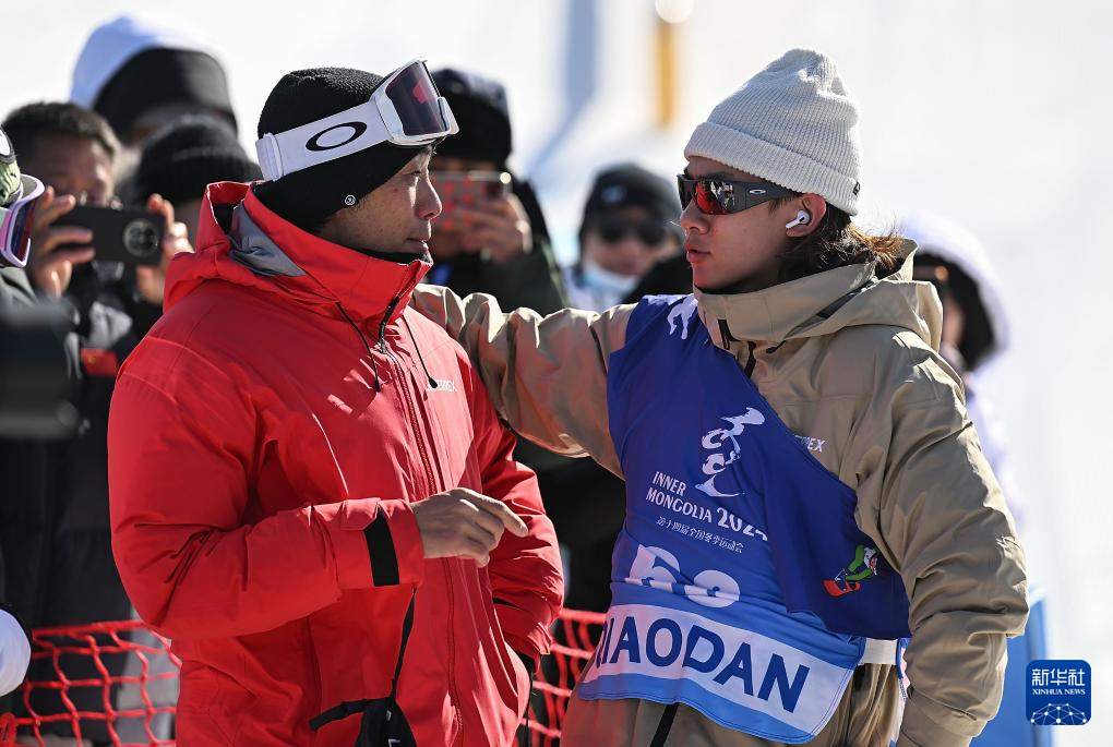 2月24日,山西队选手苏翊鸣(右)在赛后与教练佐藤康弘交流。新华社记者 贝赫 摄