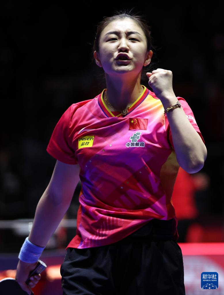 2月24日,中国队选手陈梦庆祝第五盘比赛获胜。最终,她3比1战胜日本队选手张本美和。
