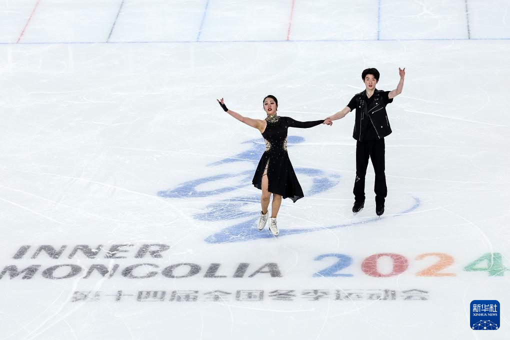 2月21日,香港队组合康然(左)/邹函运在第十四届全国冬季运动会花样滑冰公开组团体赛冰舞韵律舞比赛中。