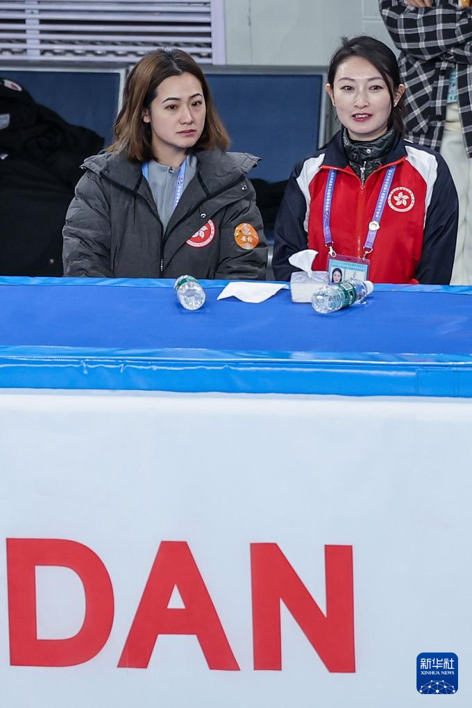 2月21日,在第十四届全国冬季运动会花样滑冰公开组团体赛冰舞韵律舞比赛中,中国香港滑冰联盟主席叶丹丹(左)和香港队冰舞项目教练杨芳在场边观赛。
