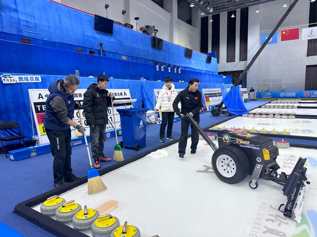 冰壶公开组男子和女子循环赛正在进行,制冰团队中的14名制冰师和6名志愿者随时待命。每场比赛后,制冰师都要用刮冰车把旧的冰点全部移出,恢复冰场的平整度,清扫之后再重新喷打新的冰点,恢复冰面的滑度。