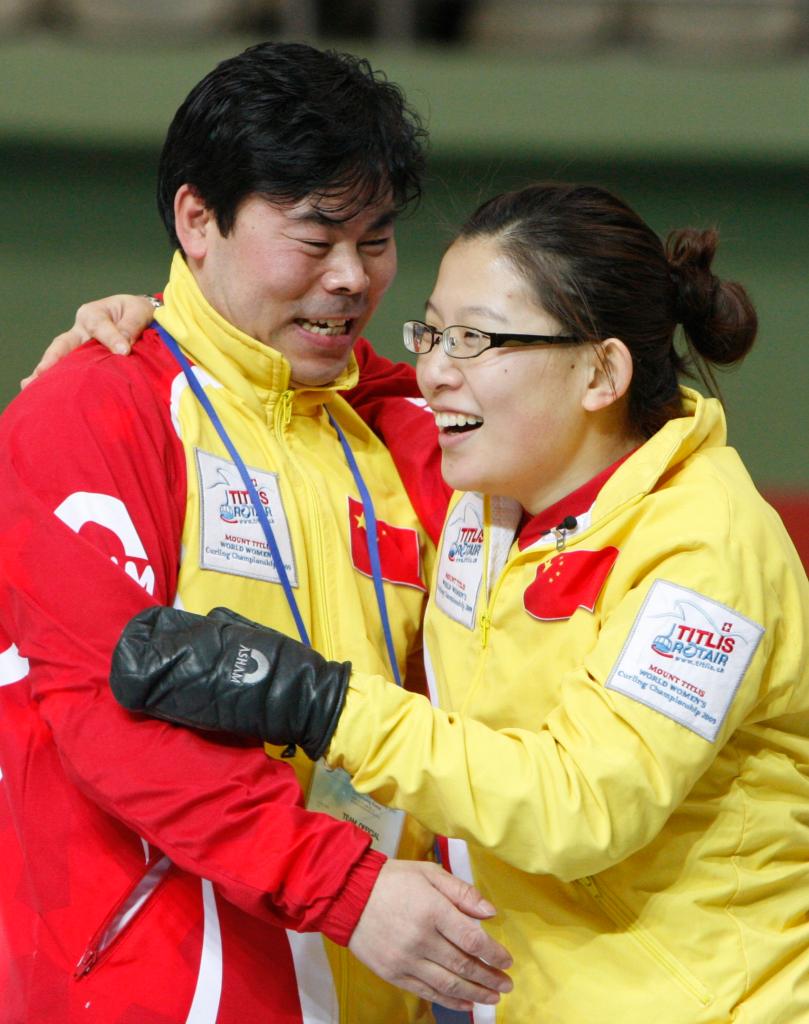 2009年3月29日,中国女子冰壶队在韩国江陵举行的2009世界女子冰壶锦标赛上夺得冠军,中国队队员王冰玉(右)赛后和主教练谭伟东拥抱庆祝。