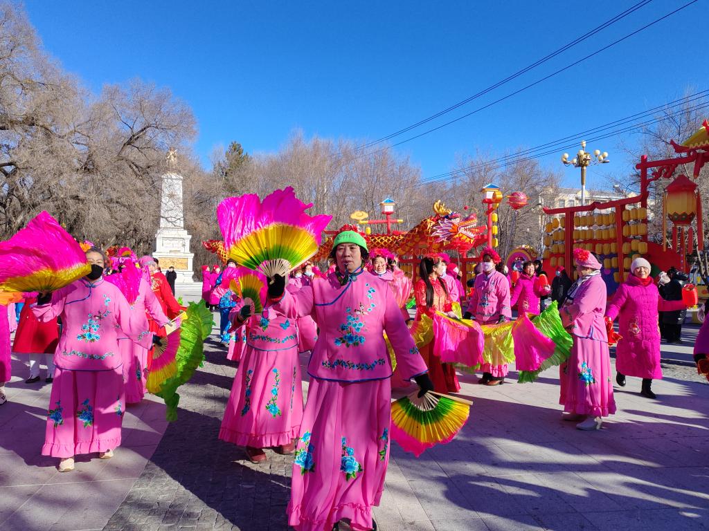 新华社呼和浩特2月24日电 24日正值中国传统节日元宵节,第十四届全国冬季运动会雪上技巧项目举办地扎兰屯天气回暖,阳光和煦。上午10点钟,扎兰屯市吊桥公园的广场上,当地群众身穿鲜艳服装,伴随喜庆音乐送上传统秧歌和舞龙表演,不时引来观众连连喝彩。
