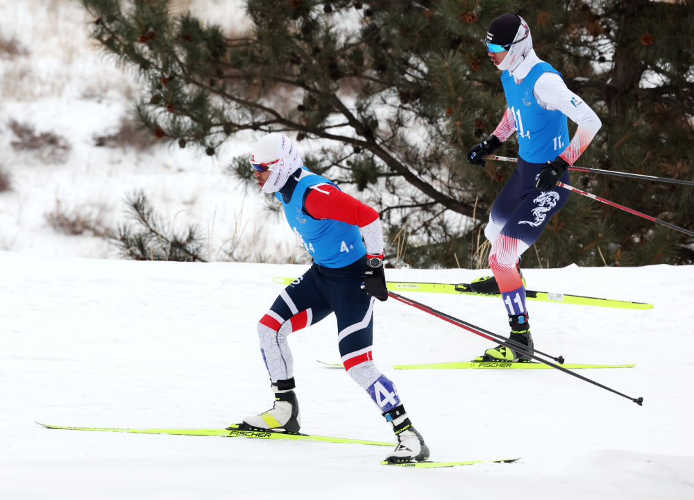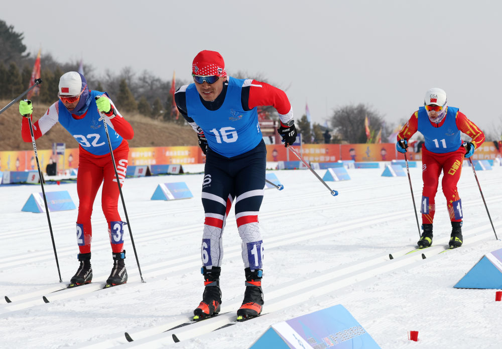 ↑2024年2月24日,吐尔松江·布尔力克(左)在第十四届全国冬季运动会越野滑雪公开组男子50公里集体出发(传统技术)比赛中。