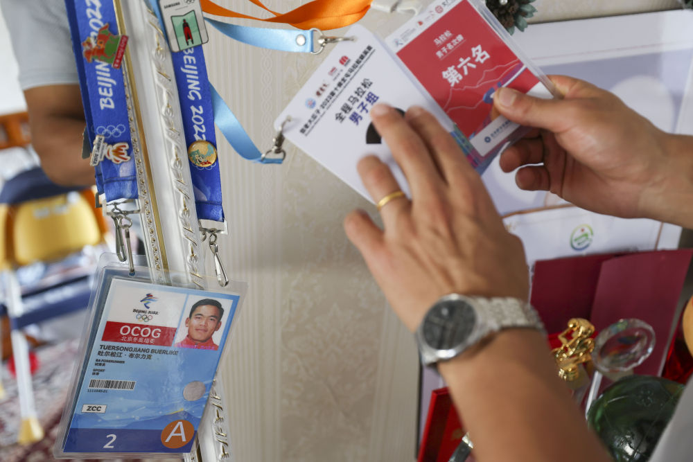 ↑2023年11月16日,在位于乌鲁木齐市米东区的家中,吐尔松江·布尔力克向记者介绍近几年的参赛经历。