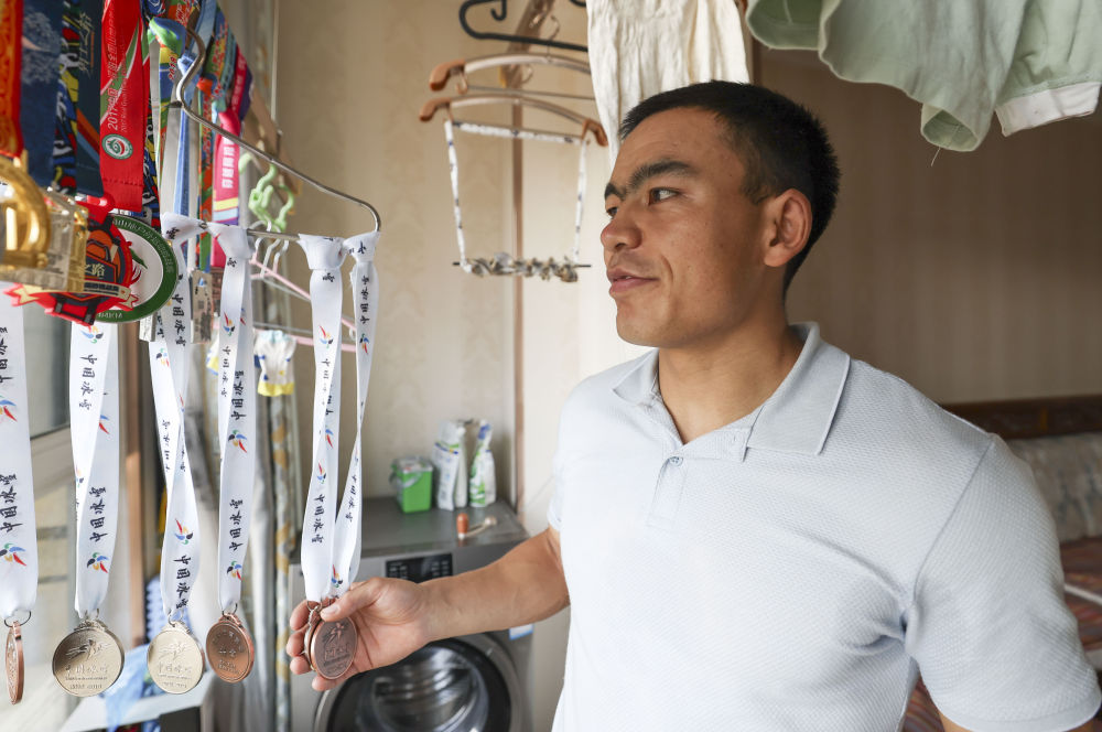 ↑2023年11月16日,吐尔松江·布尔力克在位于乌鲁木齐市米东区的家中向记者展示自己获得的奖牌。