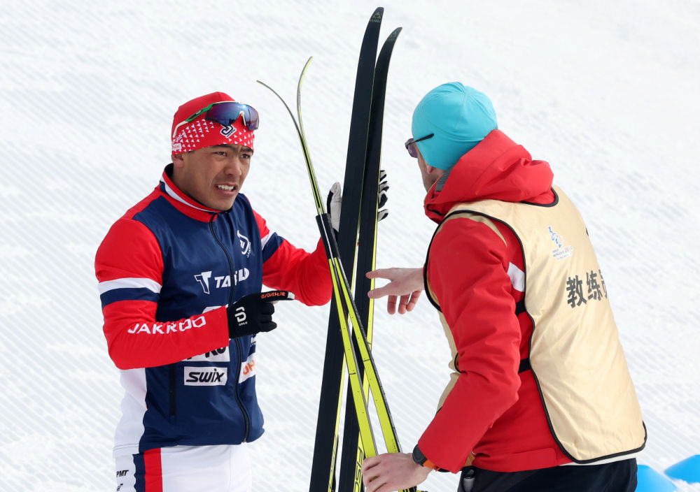 ↑2024年2月24日,吐尔松江·布尔力克(左)在第十四届全国冬季运动会越野滑雪公开组男子50公里集体出发(传统技术)比赛前与教练交流。