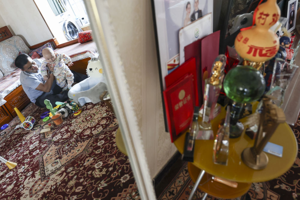 ↑2023年11月16日,在位于乌鲁木齐市米东区的家中,吐尔松江·布尔力克陪儿子玩耍。