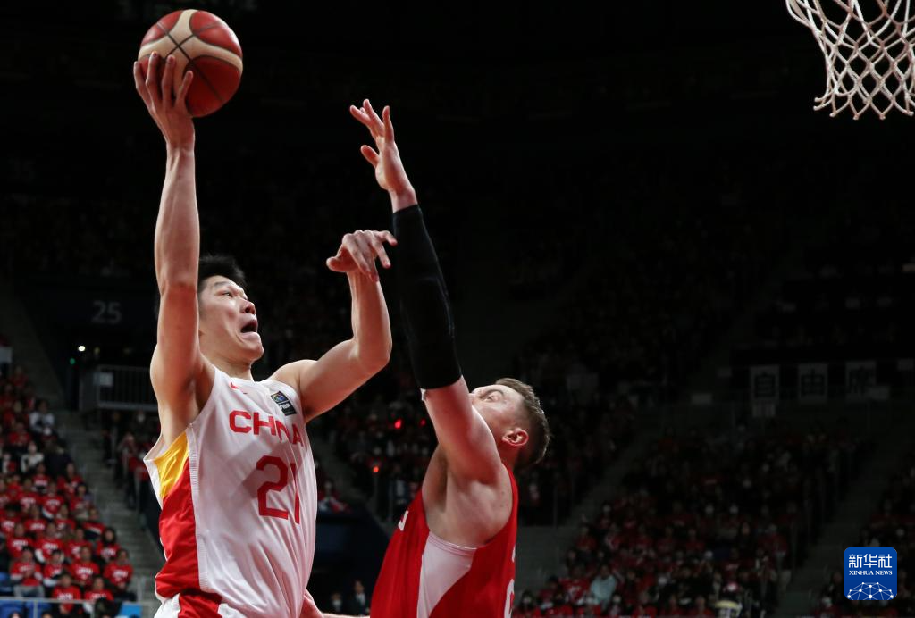 2月25日,中国队球员胡明轩(左上)在比赛中投篮。