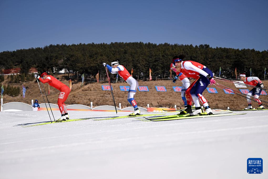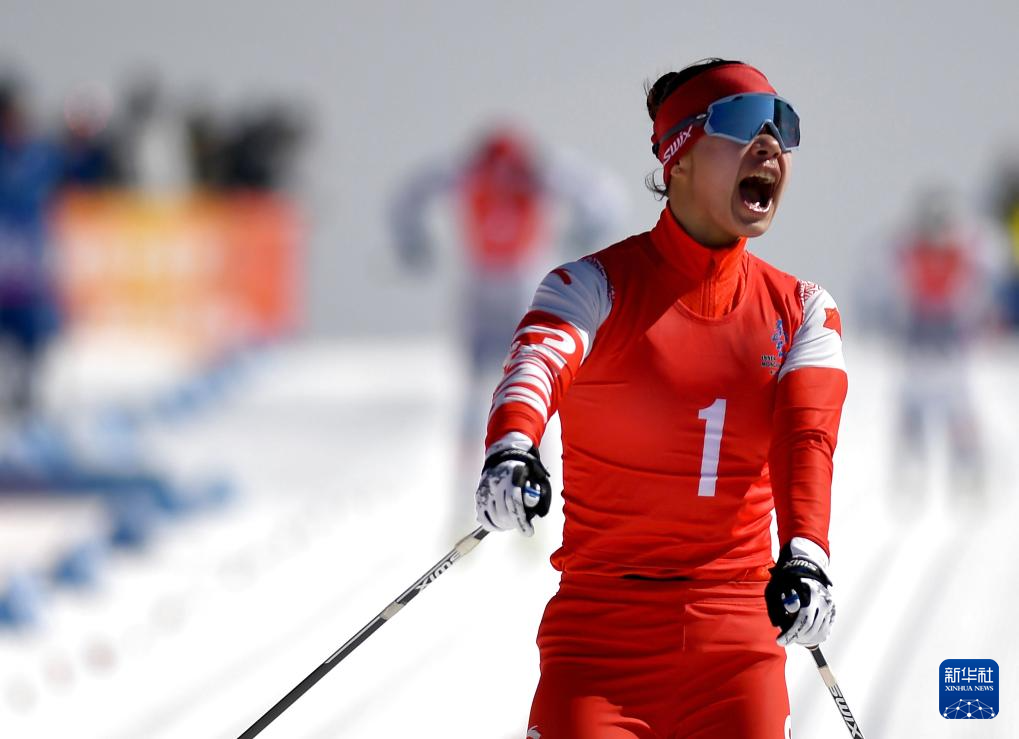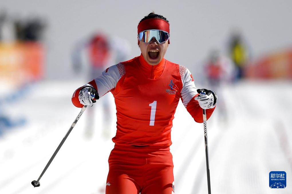 2月25日,黑龙江队选手靳然在冲刺时庆祝。