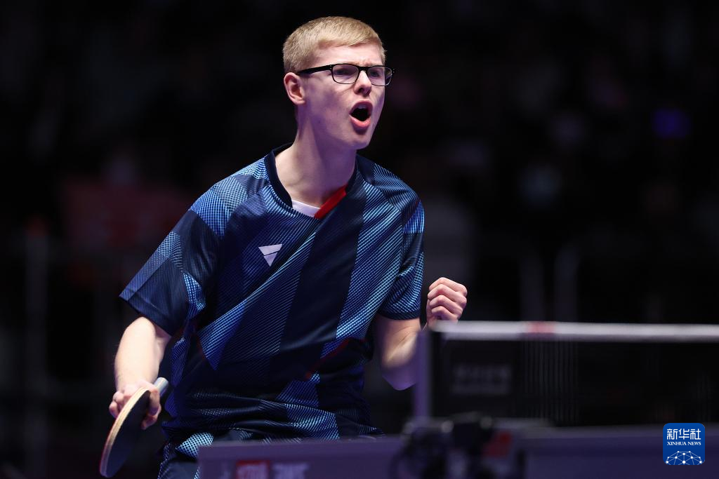 2月25日,法国队选手费利克斯·勒布伦在第一盘比赛中庆祝得分,他0比3不敌中国队选手王楚钦。新华社记者 杨世尧 摄