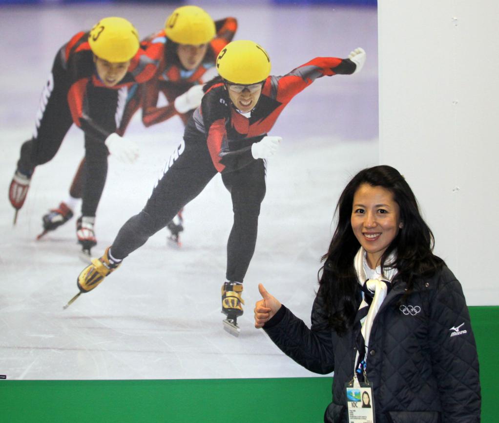 2010年2月12日,杨扬与自己的照片合影。当日,在温哥华举行的国际奥委会第122届全会上,她当选为国际奥委会委员。新华社发(张震摄)