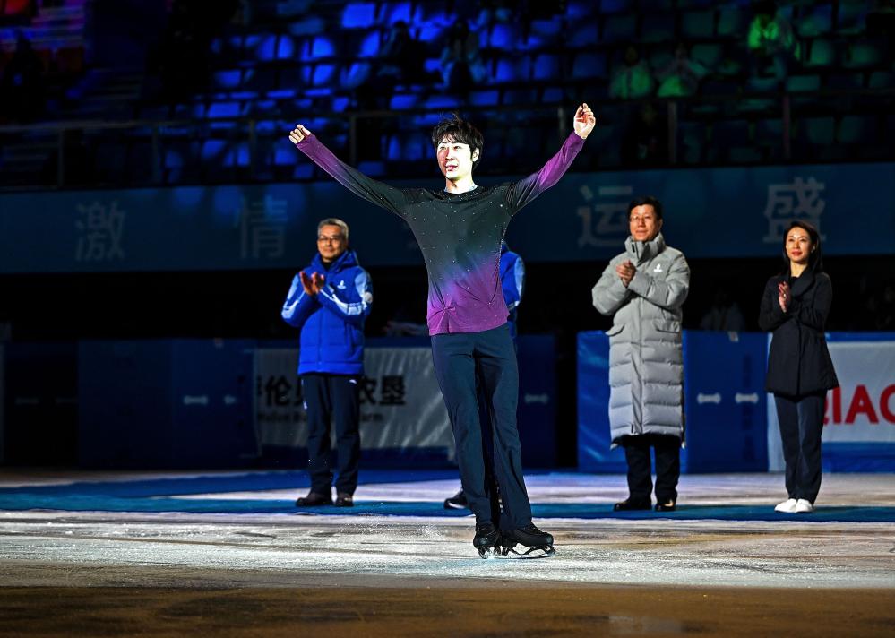 2月26日,北京队选手金博洋(前)在颁奖典礼上登场。新华社记者 连振 摄
