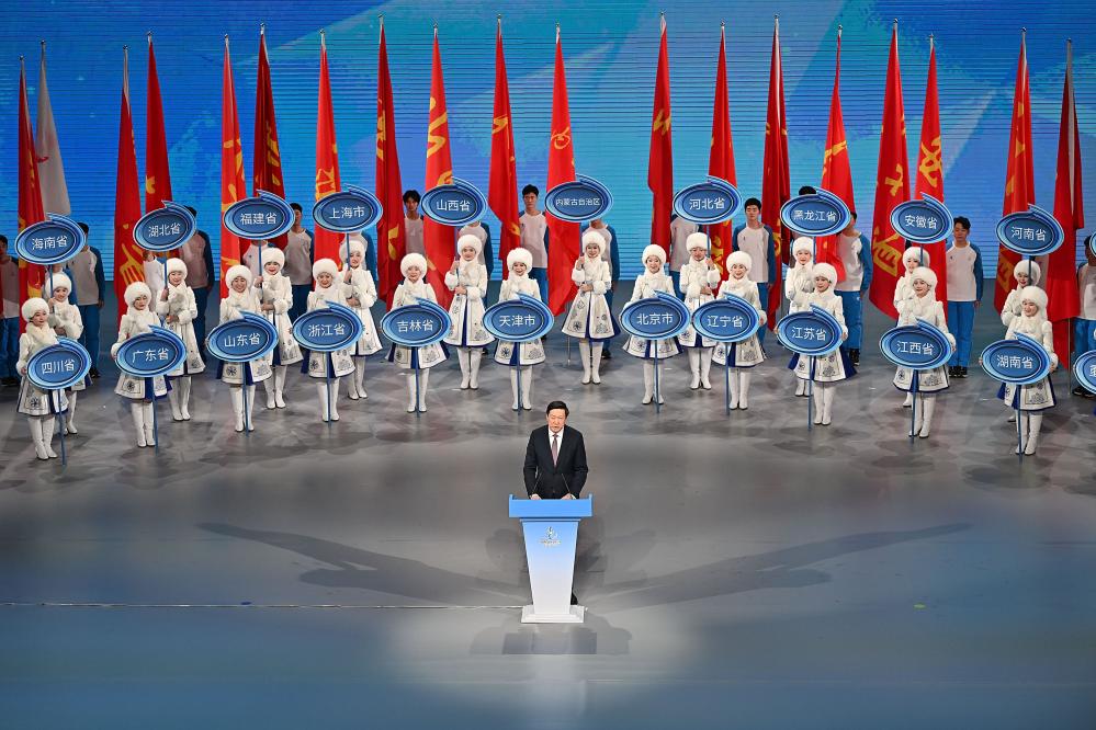 2月27日,第十四届全国冬季运动会组委会主任、国家体育总局局长高志丹致闭幕辞。新华社记者 胥冰洁 摄