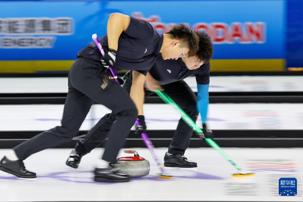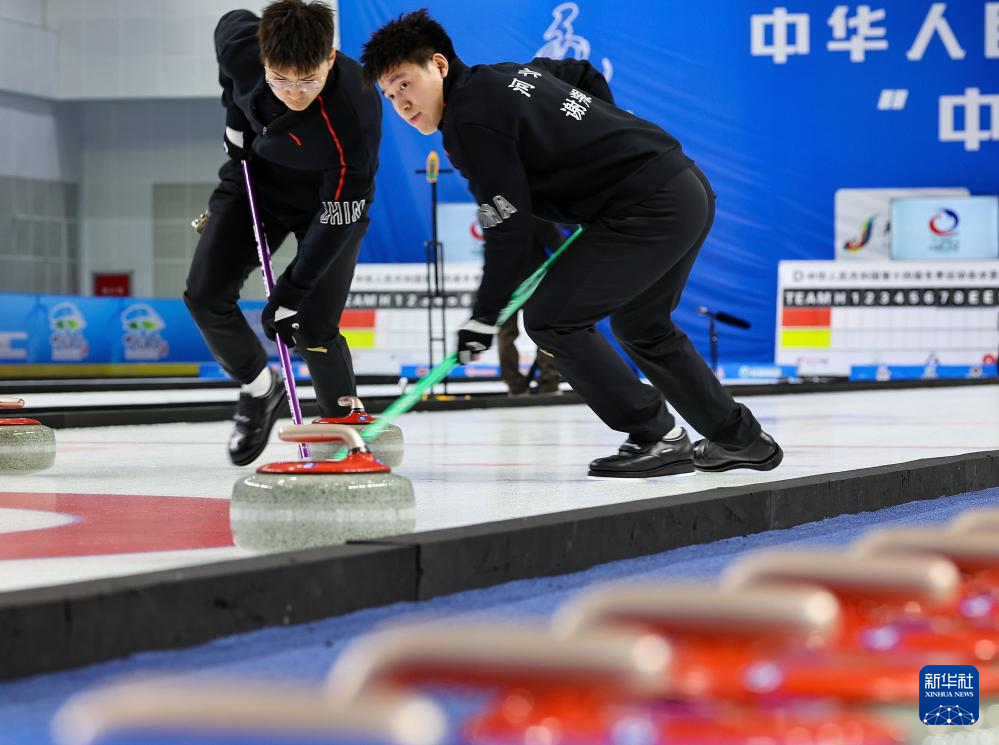 2月26日,河北队选手李智超(左)和谢兴银在比赛中擦冰。新华社记者 姜帆 摄