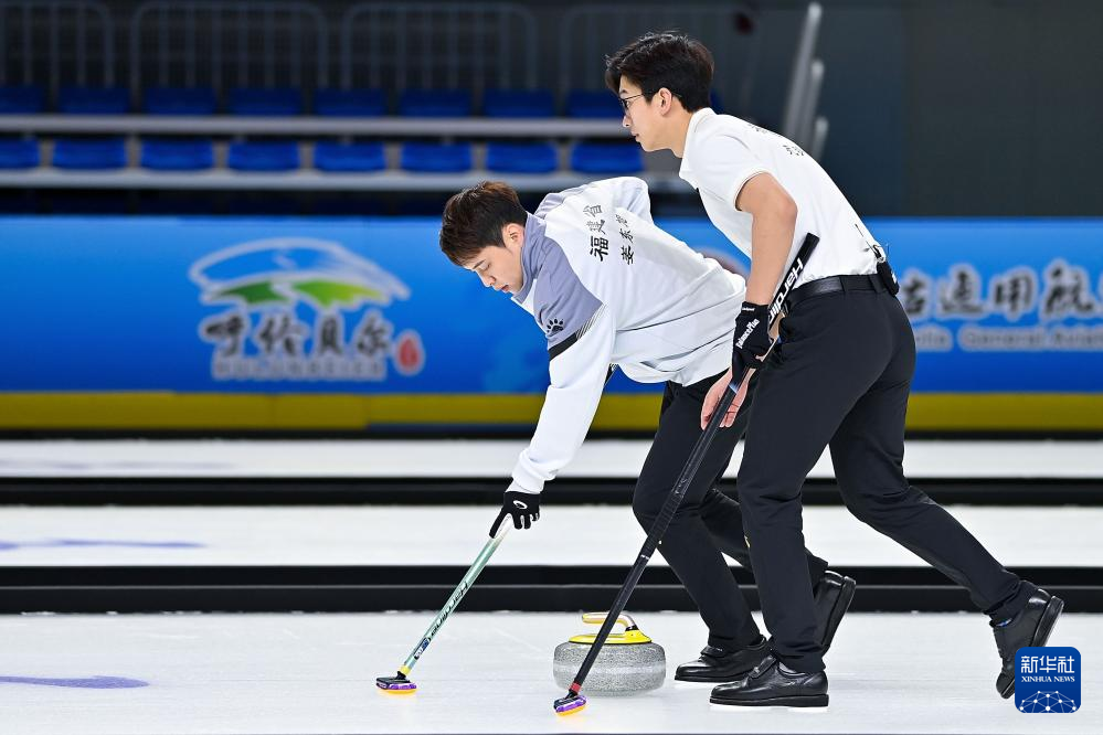 2月26日,福建队选手姜东旭(左)和苑明杰在比赛中擦冰。新华社记者 杨晨光 摄