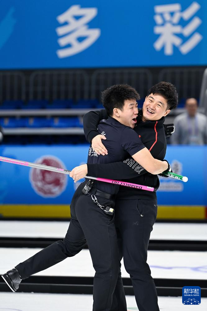 2月26日,河北队选手徐晓明(右)和谢兴银在夺冠后拥抱庆祝。新华社记者 杨晨光 摄
